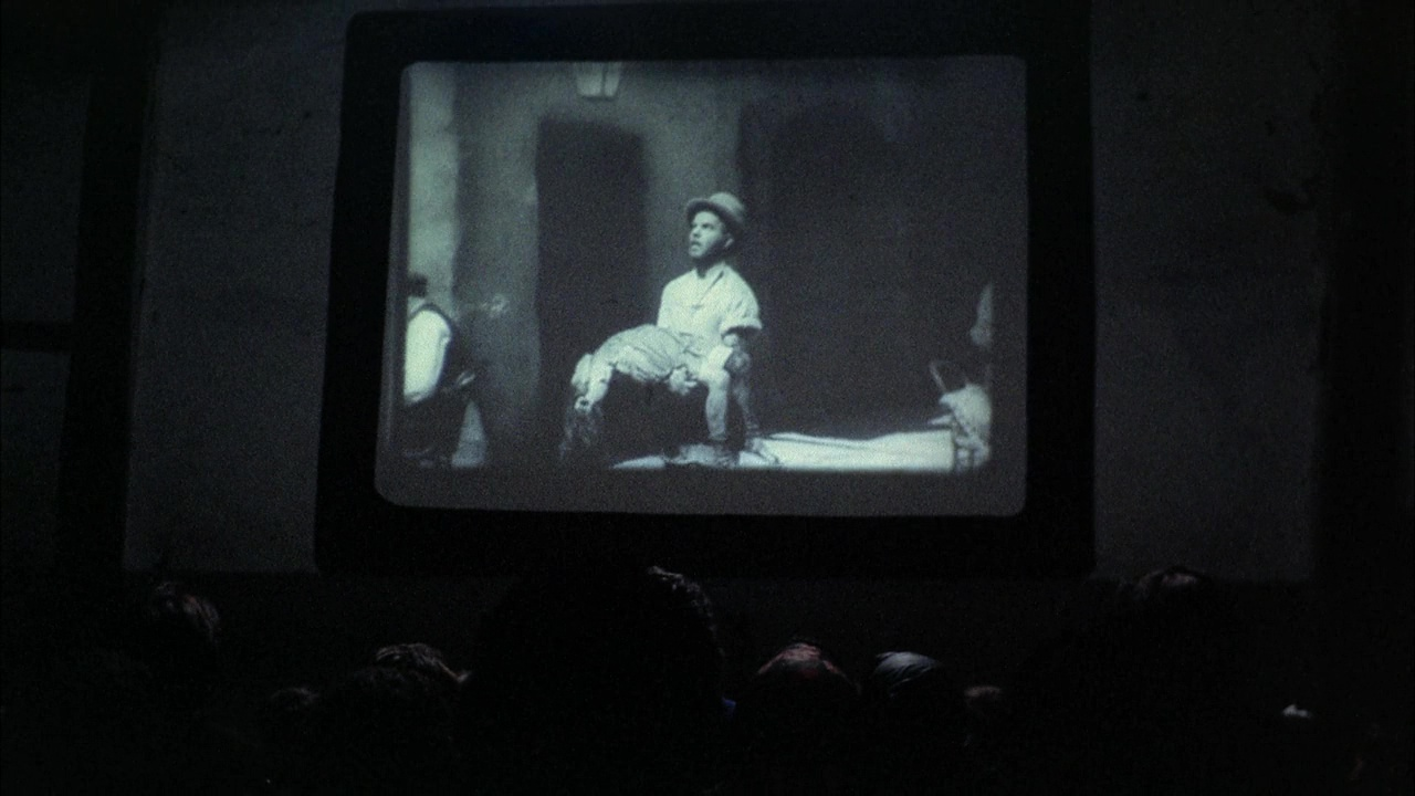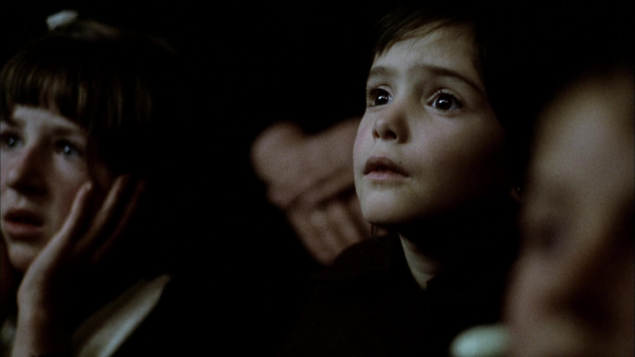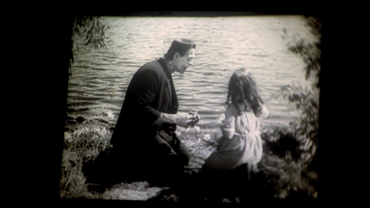 Or why not begin with the first scene of the film, in which a travelling cinema brings a film to the town's hall: James Whale's legendary Frankenstein of 1931. At 5pm precisely, the screening begins, and the two daughters attend, transfixed by what unfolds, in black and white, before them.