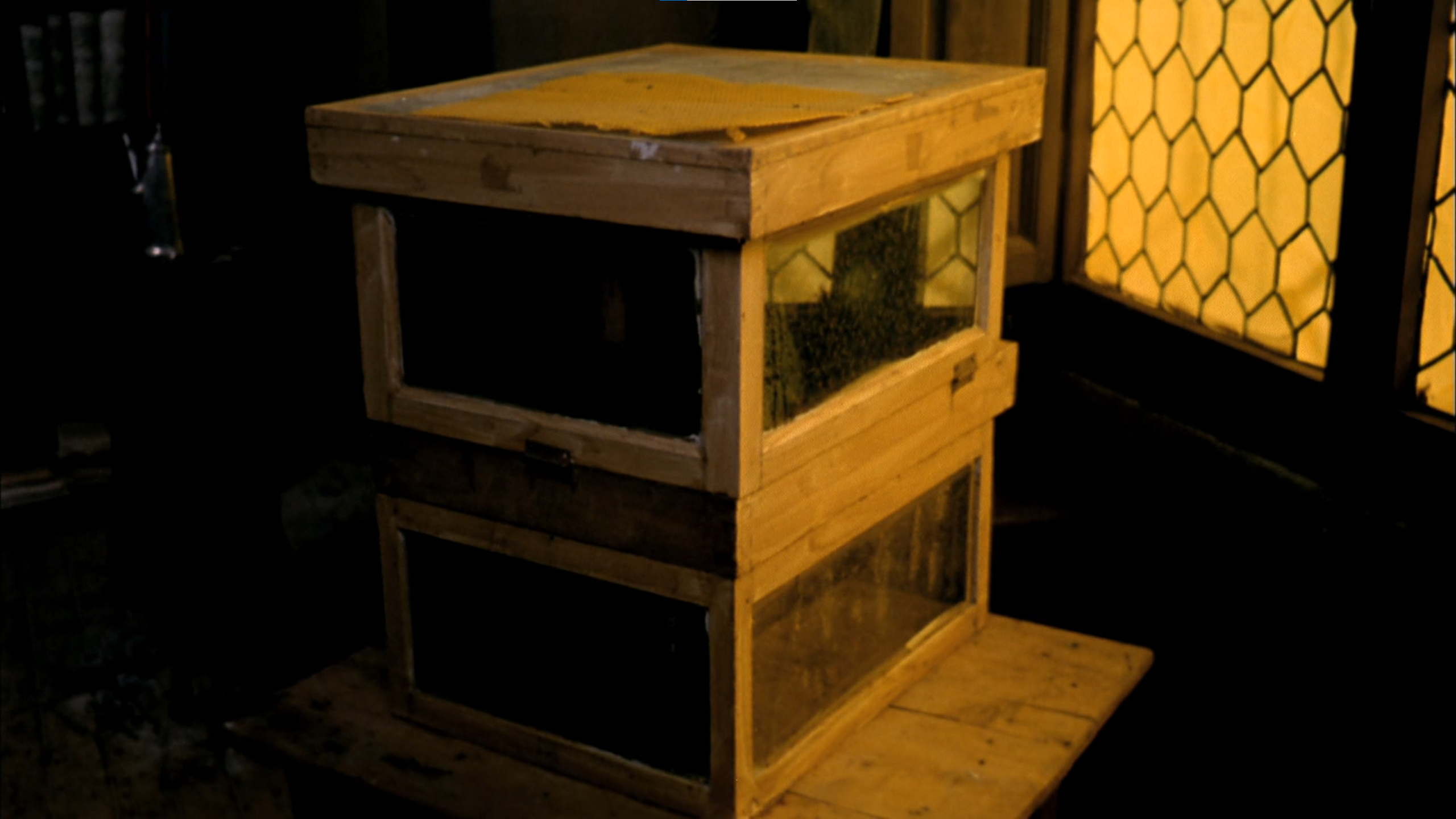 Because of the honey touch of this light, and because the hexagonal structures of the windows – origin, as filter, of the light – obviously resemble the wax cells of a honeycomb (as if every window were a comb), it has always been tempting to read the beehive as the analogon to the life of this family, or maybe to life in post-Civil War Spain altogether, governed by an incomprehensible, alien, absently reigning force in the shape of El espíritu. The colmena neither begins nor ends in one (or the sum) of Fernando's hive boxes, but encompasses social life of the whole family, living as they are between the honeycombs, in golden light, following their little schedules, incomprehensible to each other, incomprehensible to us: what is Fernando writing, exactly? To whom is Teresa writing; does the addressee exist somewhere outside her head? Does Isabel believe in the spirit, or is she only pretending she does and tries to make the younger and more naive Ana believe in it, in some game of power? Does Ana believe in the spirit; and is the spirit the same as El espíritu [de la colmena]?