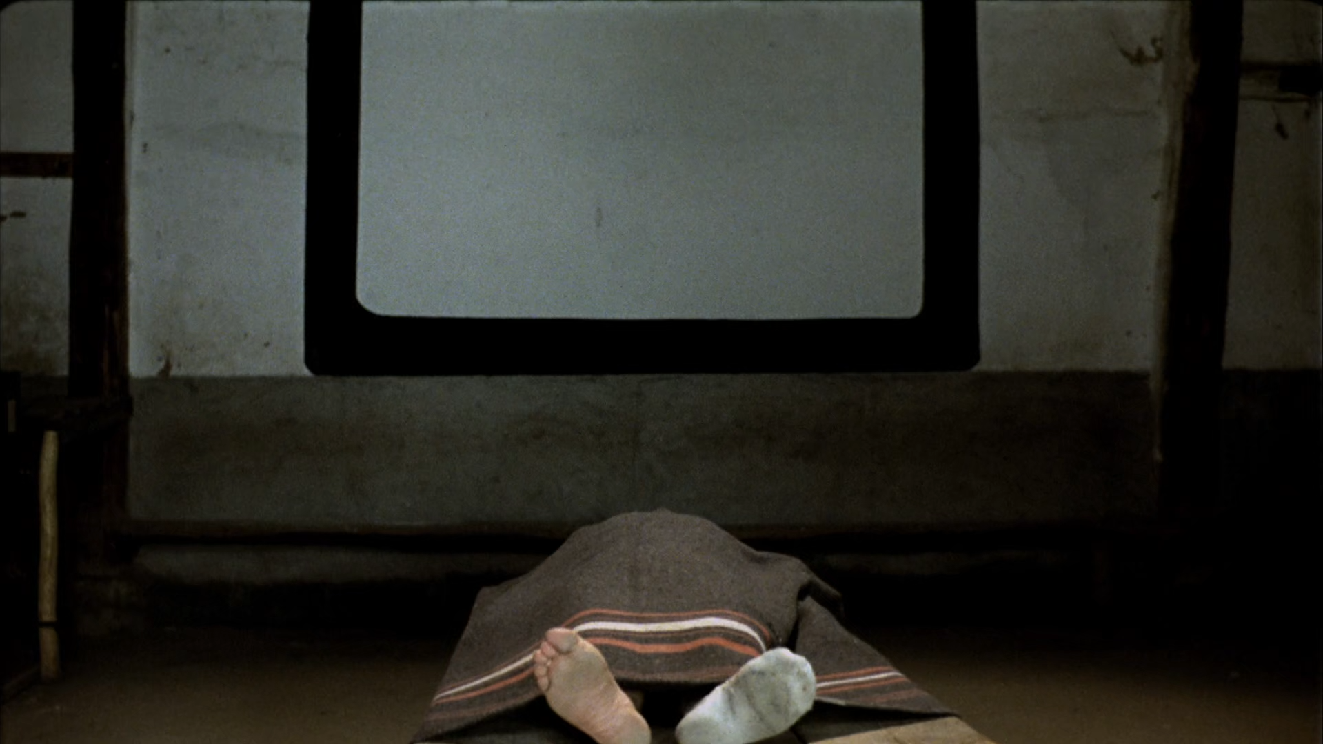 It is only when el coco appears and is killed that it no longer exists, which is why Teresa burns the letter: Writing to something that does not exist yet was possible ("It's difficult to feel nostalgic after what we've been through these past few years"), but writing to something that did not exist and then stopped existing is impossible. To Teresa, this step must feel like disappointment; to Ana, the encountering of the espíritu as no more nor less than that is something that can be framed in a teleologic of 'growing up'. Both must feel the sudden anulment of a considerable libidinal investment. Both must feel that a lot more and a lot less than a human being has died in that little hut. Both have a scene featuring a fire shortly after the refugee's death: in Teresa's case, it's the scene before the fireplace with her burning the letter; in Ana's, it's a scene with her watching other girls jumping through a summer solstice bonfire while standing by the side; both scenes vaguely evoking an ending, Ana's (through the solstice) quite strongly a renewal also. In the absence of both women, a third scene, with Fernando being presented with the dead refugee, unfolds; the refugee happens to lie, dead and covered with a blanket, in the town hall, just under where the screen was during the Frankenstein-screening, now empty and grey – the spirit gone: