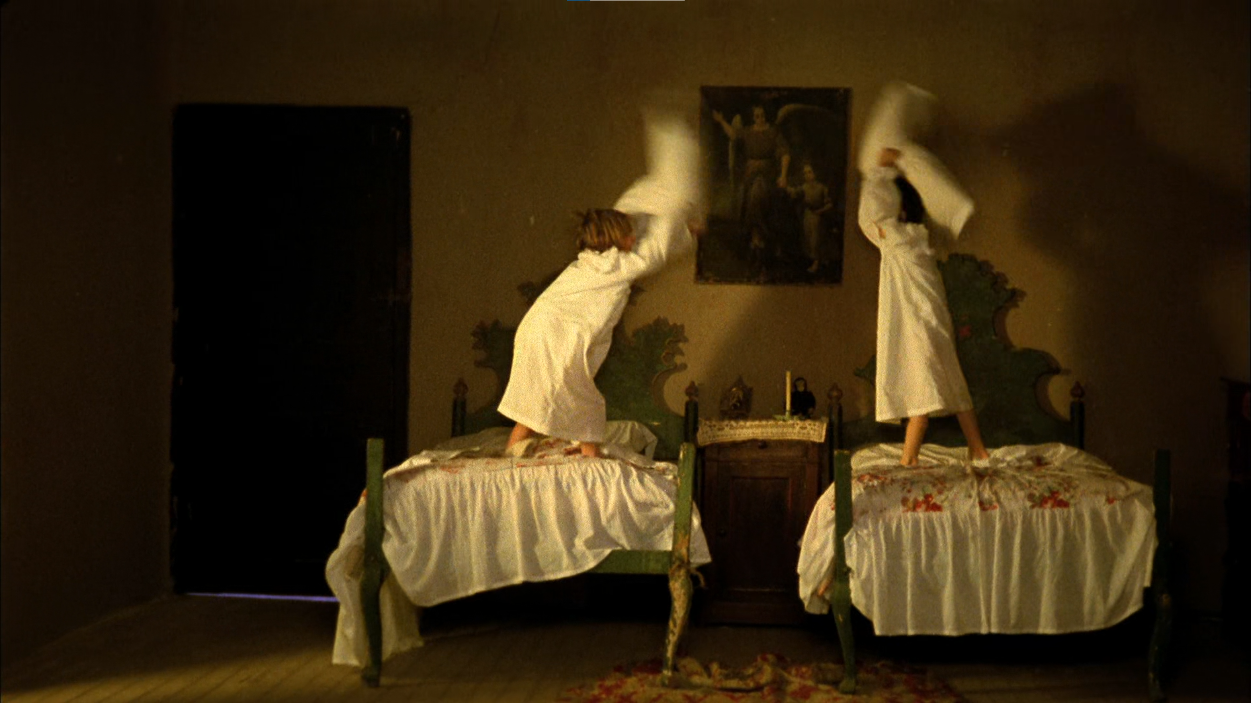 Whichever it was, Ana is deeply fascinated by the two scenes, and asks her older sister why the monster killed the girl. In the evening, lying in bed, whisperingly, she repeats the question. Her sister tells her that first, the monster is not real and it did not kill the girl, because everything in the movies is fake; and second, that the monster is an espíritu, a spirit; that it is usually incorporeal and has only assumed a body in order to meet the girl; and that she, Isabel, has met the spirit before.