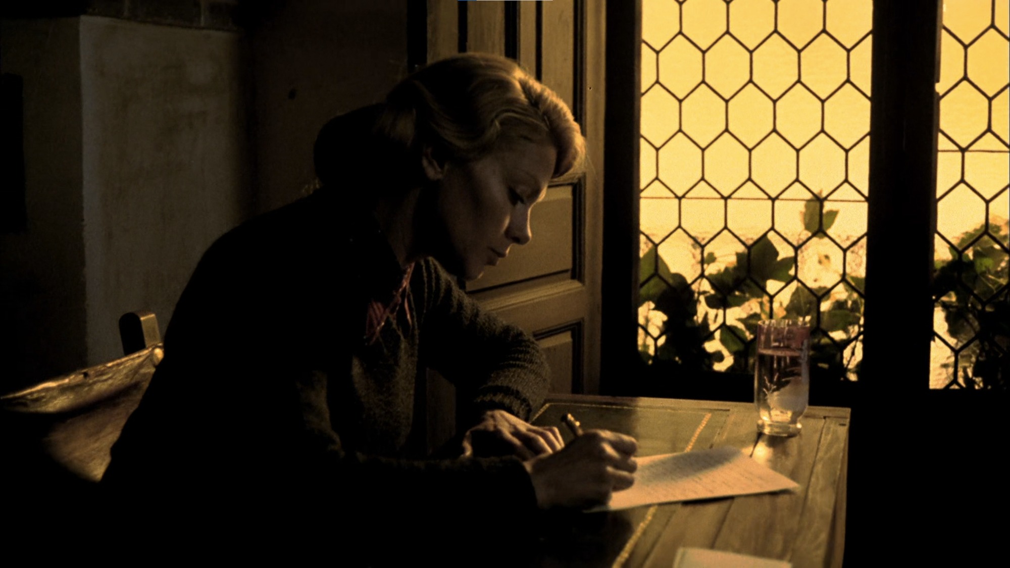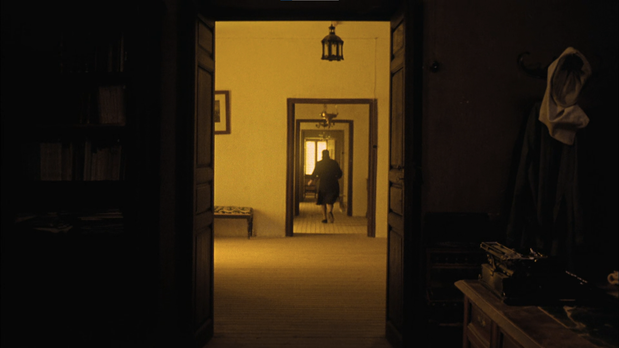 While the director, Victor Erice, had first planned to shoot El espíritu de la colmena in black and white, Cuadrado convinced him otherwise and employed his own father, a glass painter, to meticulously paint every single of those hexagonal glass fragments a mild yellow, leading to those peculiar swaths of golden haze passing through the rooms. The yellow tint is thus artificial, but intradiegetically so; it is not at all akin to the "south-of-the-border-yellow" in which Hollywood films like to drench every scene set in Mexico at least since Traffic. There is a particular hue to the world within the family house's walls, but there is an in-film reason for this hue; its deliciousness and its enigma are part of the filmic world itself, that is of its Bildraum.