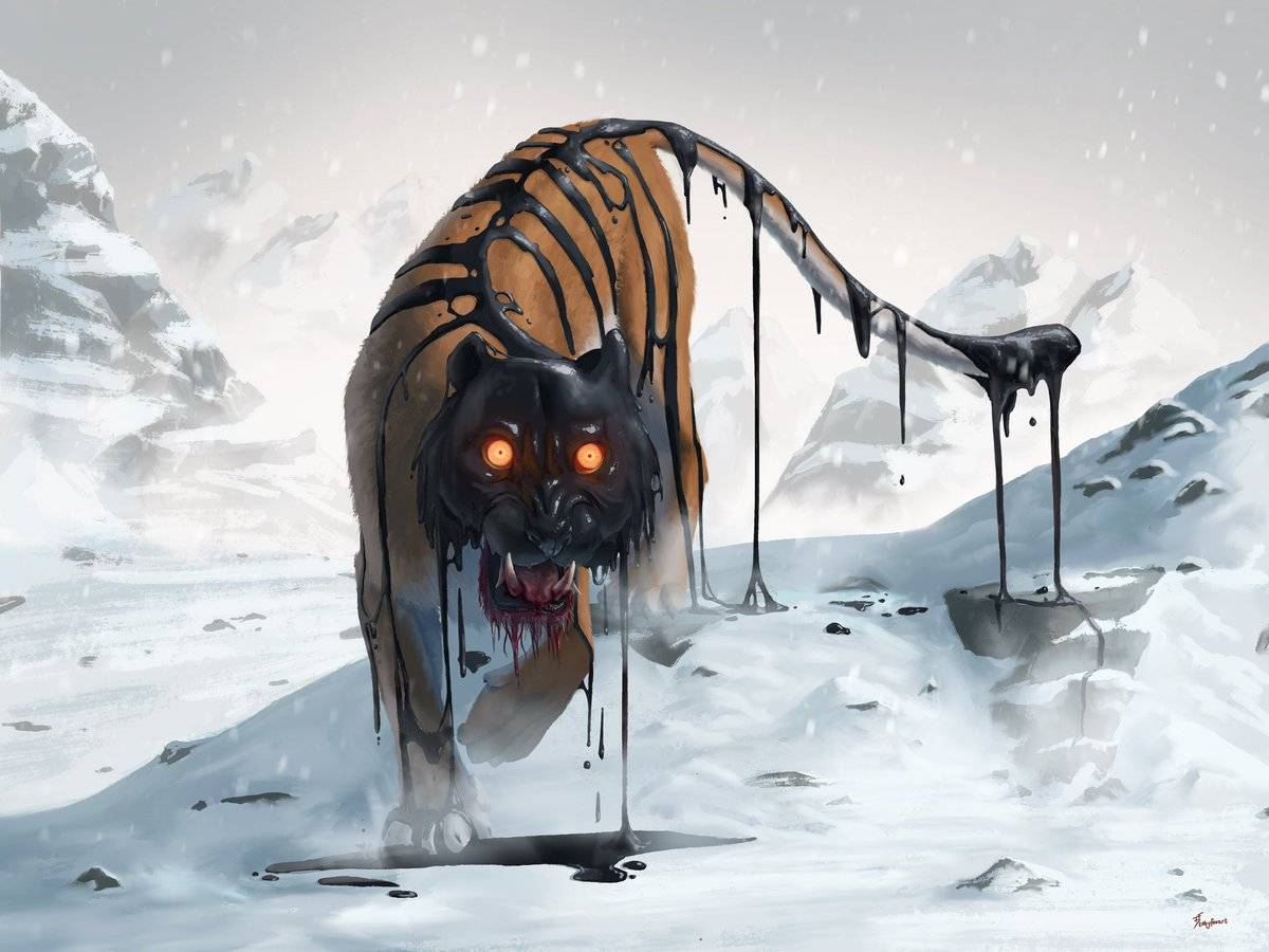 and when they were renovating that farm house somewhere south of Kraków, on a meadow near a forest, and it was a marvellous, mild Autumn, and they were getting rid of the lead paint and sanding and waxing the beautiful heavy floorboards, and the sunlight fell in through the windows and they drank cold fountain water and looked at their work, the air cool on their sweaty brows, and they were talking to each other about how they would invite all their friends, and have a three-day party, and how their friends would like it so much that they would stay and live with them, just the best ones, the ones closest to their hearts, and they would sit on the veranda and maybe start smoking pipes full of sweet tobacco, and there would be children and dogs and cats and hens running about everywhere, it would be chaos but comfortable chaos, honey-like, dripping from the walls and from that magical attic where they planned to have something like an old-fashioned home cinema with a projector and everything, and show films they loved, and they would be able to open the freshly installed attic windows and let the night breeze in, and it would be lovely, and they realized they were building a dream home and it would house a dream tiger, and they would encounter it, in the night time, in the black corridor that led to the bahtroom, and it would look like this