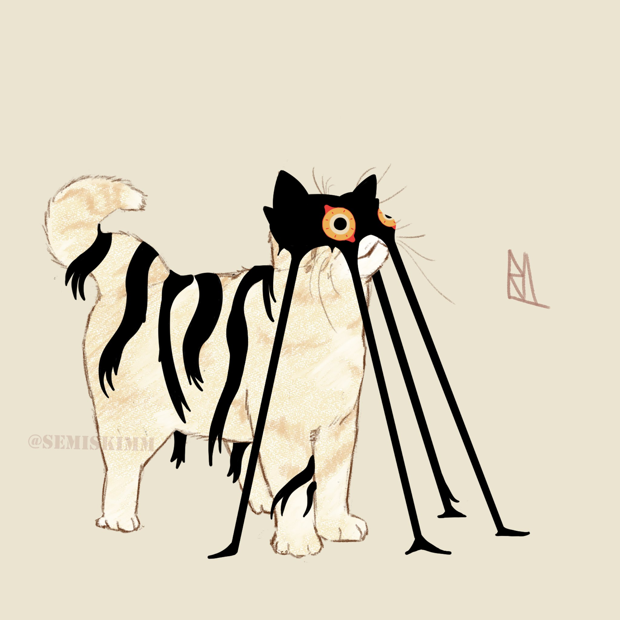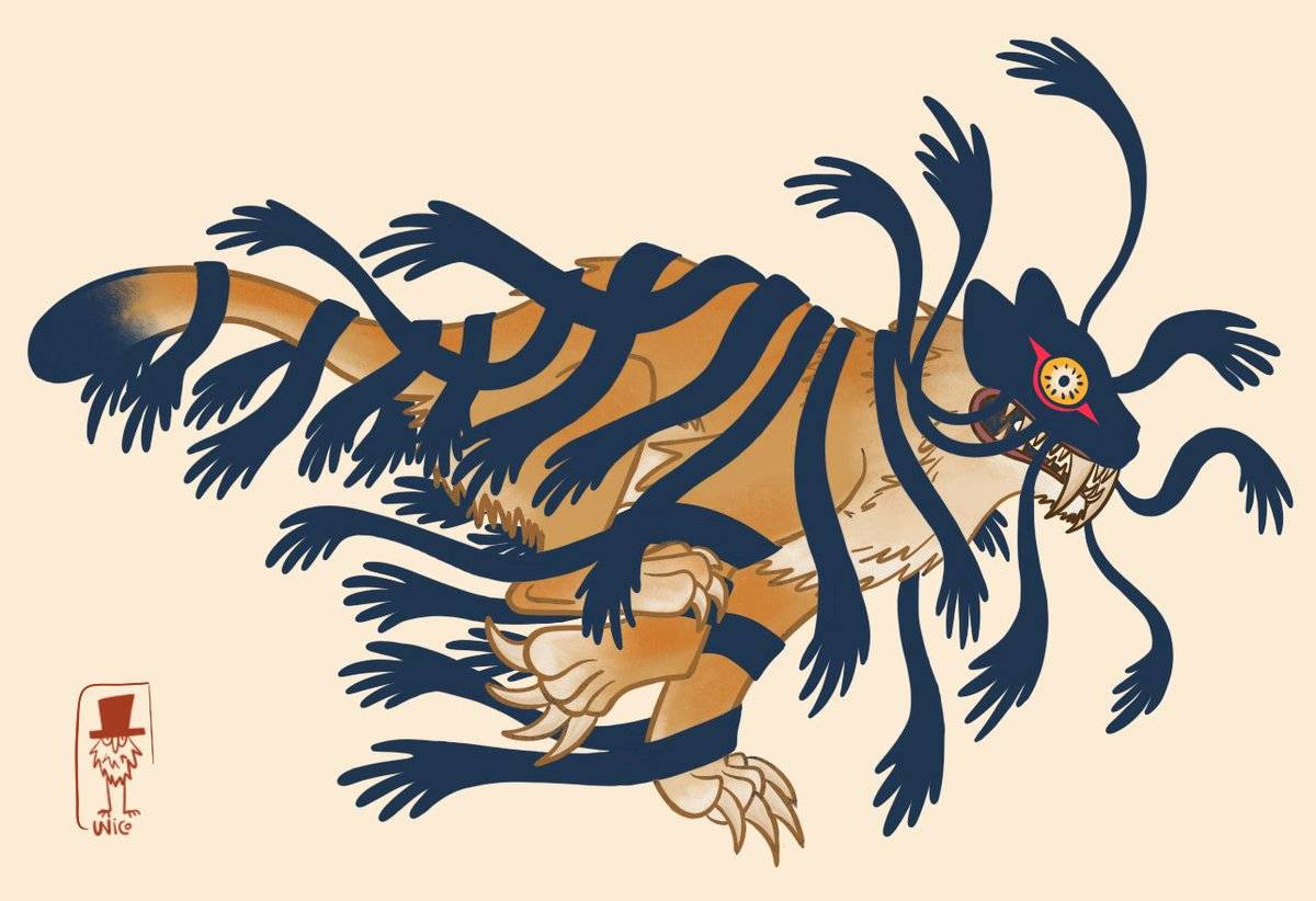 back when they ran a soup restaurant in a small side street of Seoul and eight out of ten of their customers were strays, and they would have this little thing between each other where on some evenings they would see who could eat more of the really hot spice mixture, just spooning it in between gulps of water (50 cl of plain mineral water were allowed each), and on one of those evenings they went pretty far with it, and outside it rained because it was the end of August or maybe the beginning of September, and one of them slept like a baby afterwards and the other one had trouble sleeping because of all the heavy and hot food in their stomach, and in their unstable sleep they would dream of a strange kind of tiger, and in the morning they got up, the early air cool on their sweaty skin, and they made a drawing of the dream tiger, sitting at the bar of their little restaurant and drawing with both hands, and it would look like this
