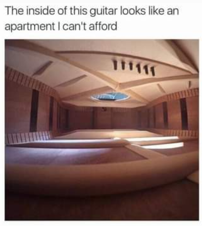 There is, of course, a homology of resonance between the sublimity of choral rooms and the inside of guitars. Both spaces tend to amplify resonance in their emptiness, the body of sound, but while one is instrumental, the other is epitome of a general desire for unaffordable living spaces. Not being in it is crucial to their consumption and enjoyment in both cases.