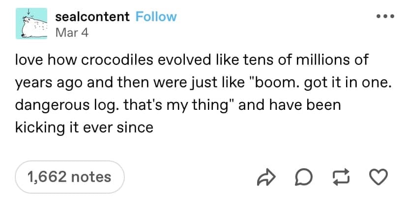 “The problem of the crocodile”, I said, “is how they evolved like tens of millions of years ago and then were just like 'boom. got it in one. dangerous log. that's my thing' and have been kicking it ever since.”